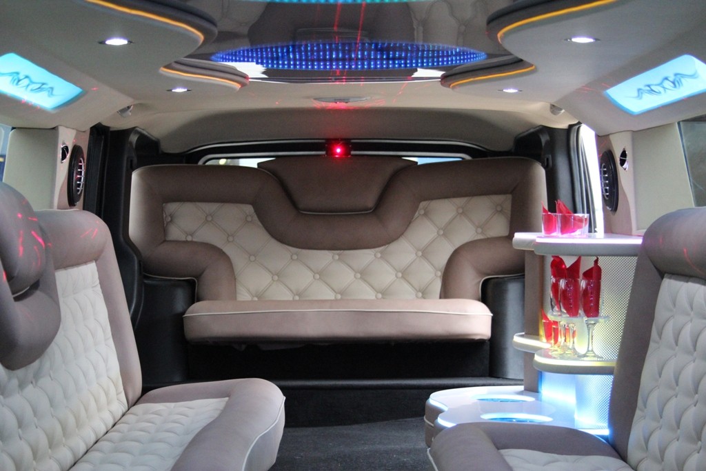 Внутри Хаммера H2 пассажиров ждет система кондиционирования, создающая комфорт в жаркую погоду, бар с отделением для льда, лазерное шоу. Кожаный салон светлого цвета украшает неоновая подсветка пола и потолка.